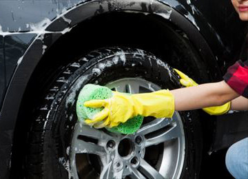 ホイールも、ホイール用のスポンジを使用して洗います。3.水で流す