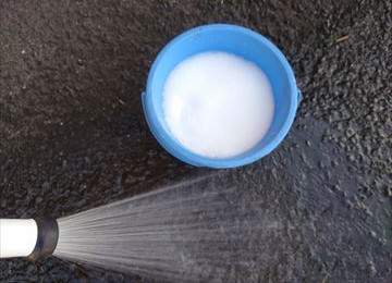 バケツに車用洗剤を入れて、高い水圧で水をそそぐことで泡立てます。