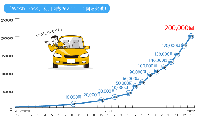 2019年12月のスタートから、洗車利用回数が200,000回を突破しましたことをお知らせします。